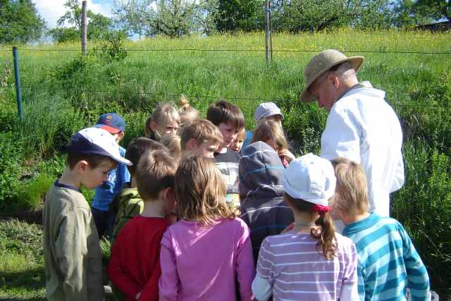 führte uns auf eine Wiese in Richtung Ohmden. Dort hat der Imker Herr Reck einige seiner Bienenvölker stehen. Die durften wir besuchen.
