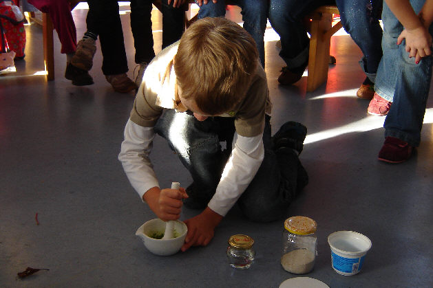 In einem Mörser haben wir ein grünes Baumblatt mit Vogelsand zerrieben.