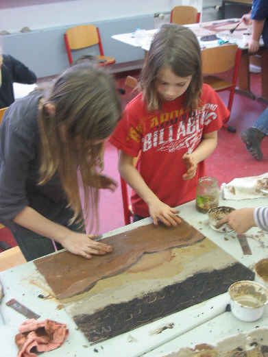 Herr Schneider, ein Bodenforscher, erklärte uns, wie die Farben und die Steine in den Boden gekommen sind. Frau Vetter, eine Künstlerin, zeigte uns, wie man Erdfarben macht. Wir haben Erde zerstampft und gesiebt. Dann kamen noch Wasser und Holzleim dazu. Es gab verschiedene Größen von Pappe. Dann ist es losgegangen mit dem Malen. Man konnte mit den Fingern, mit der Spachtel, einem Schaber oder einem Pinsel malen.